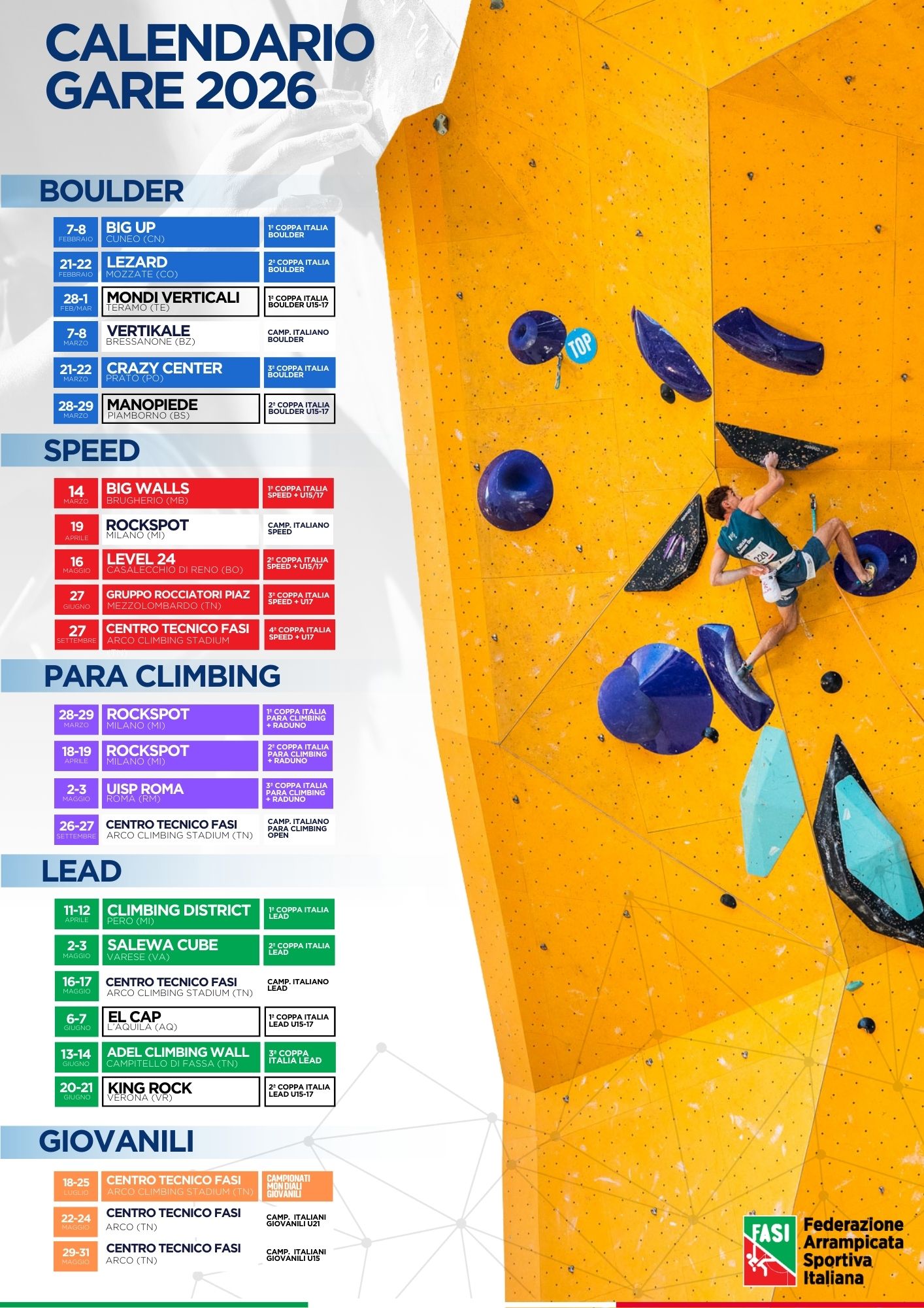 I Campionati Italiani delle varie specialità saranno così organizzati: il 7-8 marzo si disputerà il Campionato Italiano Boulder a Bressanone (Vertikale), il 19 aprile il Campionato Italiano Speed a Milano (Rockspot), il 16-17 maggio il Campionato Italiano Lead presso il Centro Tecnico FASI Arco Climbing Stadium, infine il 26-27 settembre il Campionato Italiano Para Climbing anch’esso ad Arco, che segnerà la conclusione della stagione agonistica 2026.