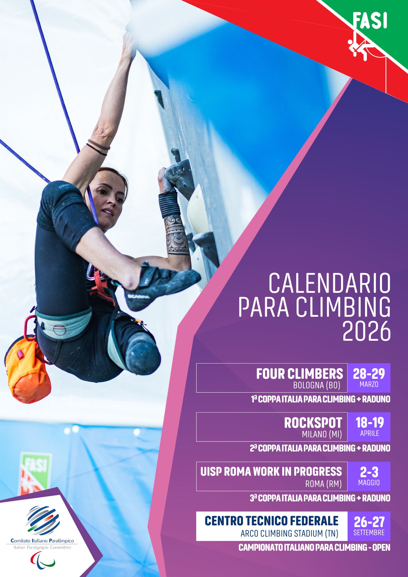 La Coppa Italia Para Climbing sarà articolata su 3 prove, fra marzo e maggio, ospitate a Bologna (Four Climbers), Milano (Rockspot) e Roma (UISP Roma Work in Progress).
