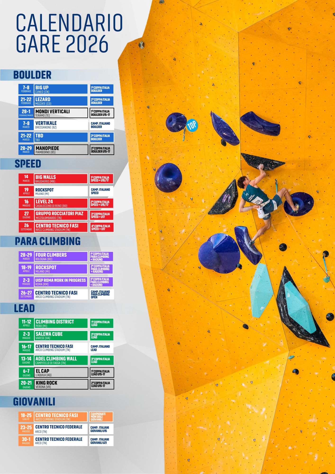 I Campionati Italiani delle varie specialità saranno così organizzati: il 7-8 marzo si disputerà il Campionato Italiano Boulder a Bressanone (Vertikale), il 19 aprile il Campionato Italiano Speed a Milano (Rockspot), il 16-17 maggio il Campionato Italiano Lead presso il Centro Tecnico FASI Arco Climbing Stadium, infine il 26-27 settembre il Campionato Italiano Para Climbing anch’esso ad Arco, che segnerà la conclusione della stagione agonistica 2026.
